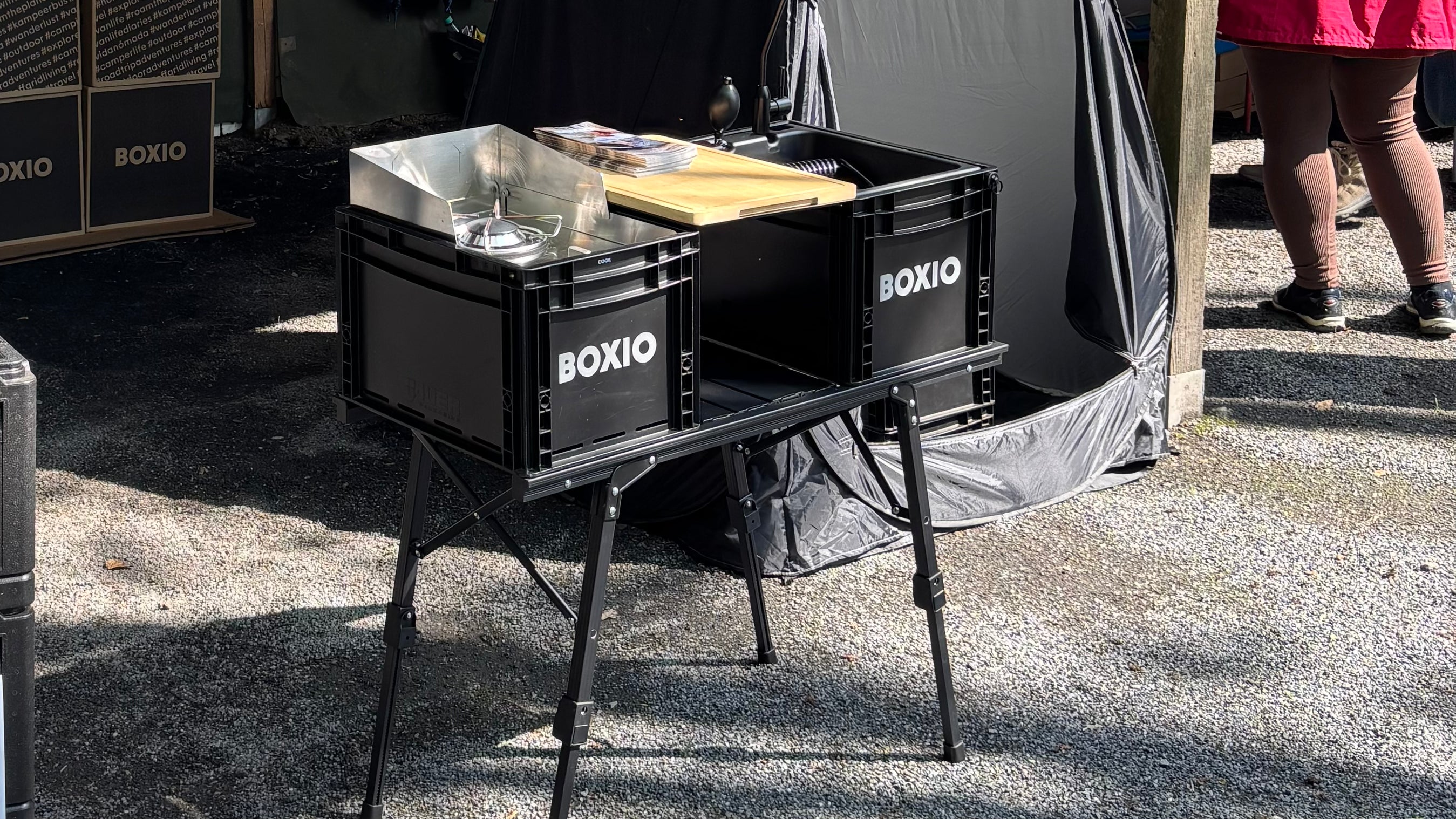 Zusammengepackt ist der Campingtisch mit unter 4 kg Gewicht und kompaktem Maß schnell verstaut und bereit für den nächsten Einsatz. So wird dein Van oder Zeltplatz zur kleinen Outdoor-Küche – durchdacht, stabil und wie immer 100 % BOXIO.