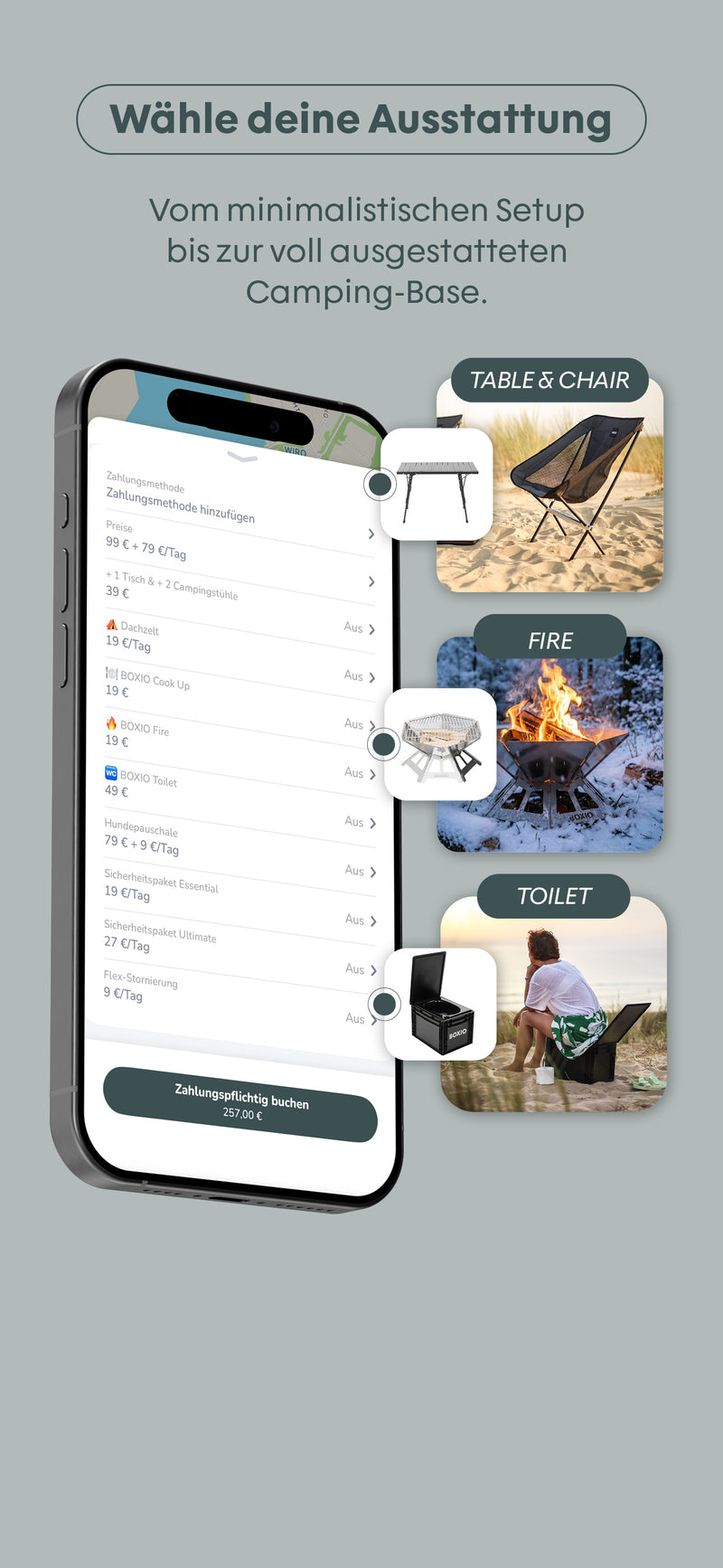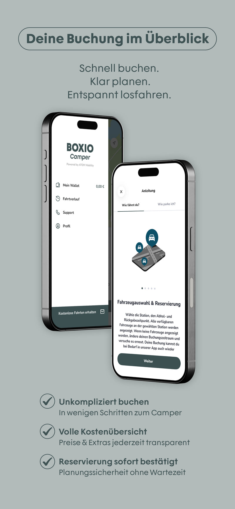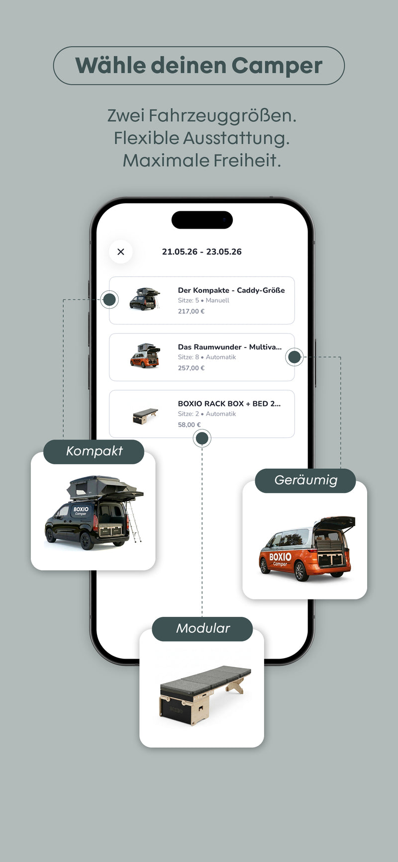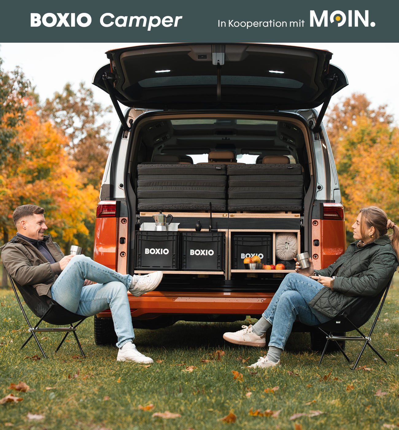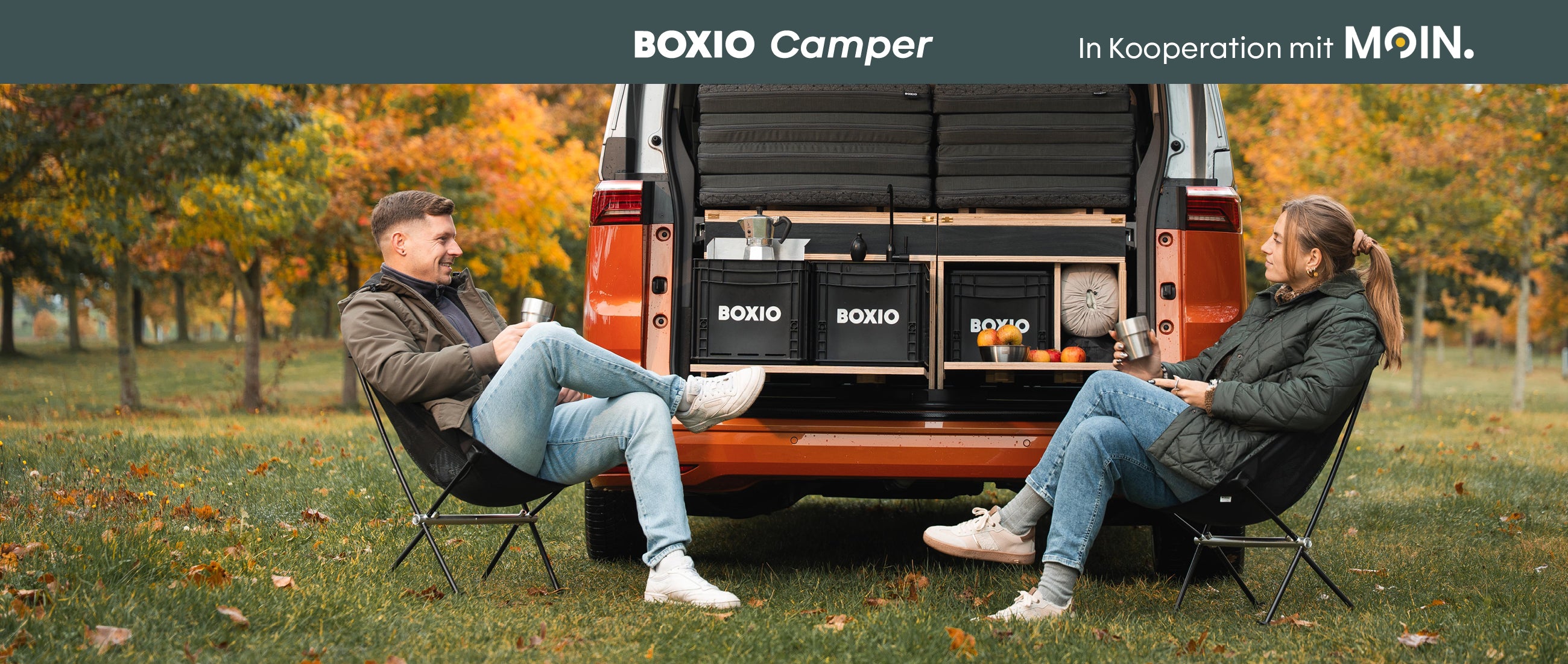 With the"BOXIO Camper" app, your next adventure with the MOIN x BOXIO campers is within reach. Check availability in real time and book your fully equipped setup directly from your smartphone.